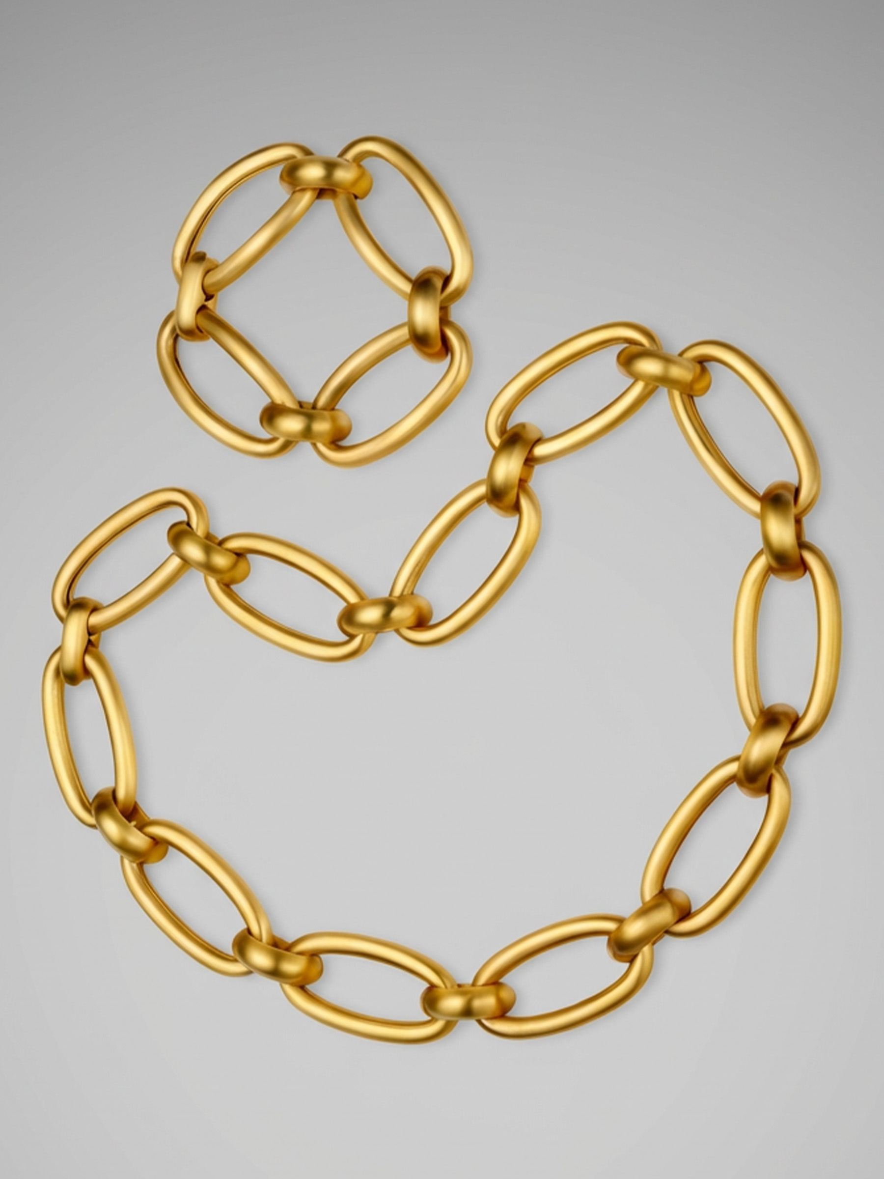 A bold yellow gold necklace and bracelet set with sculptural link design.