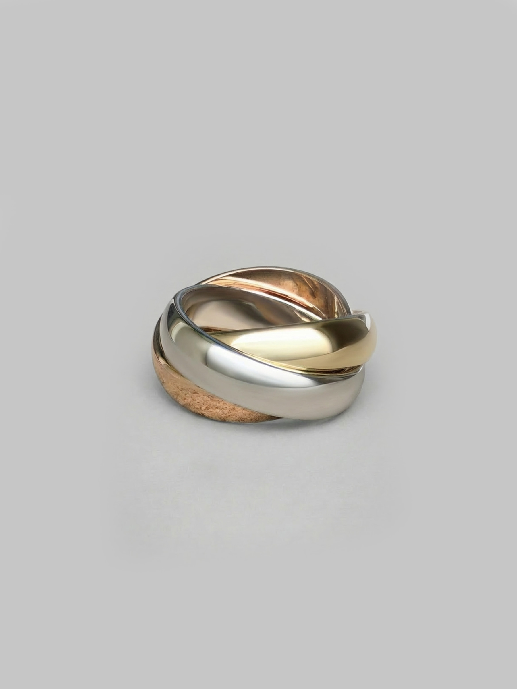 A classic 18ct Russian wedding ring of interlocking yellow, white and rose gold bands symbolising unity.