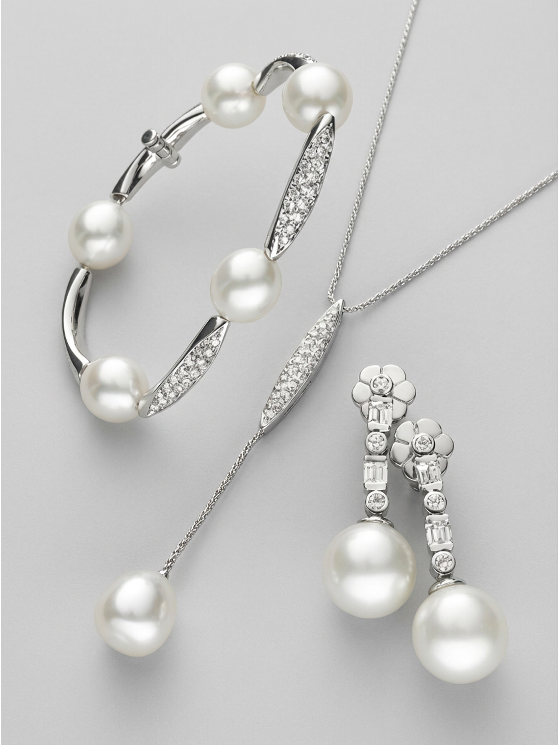 A refined Australian South Sea pearl suite in 18ct white gold with diamond detailing, celebrating balance and luminosity.