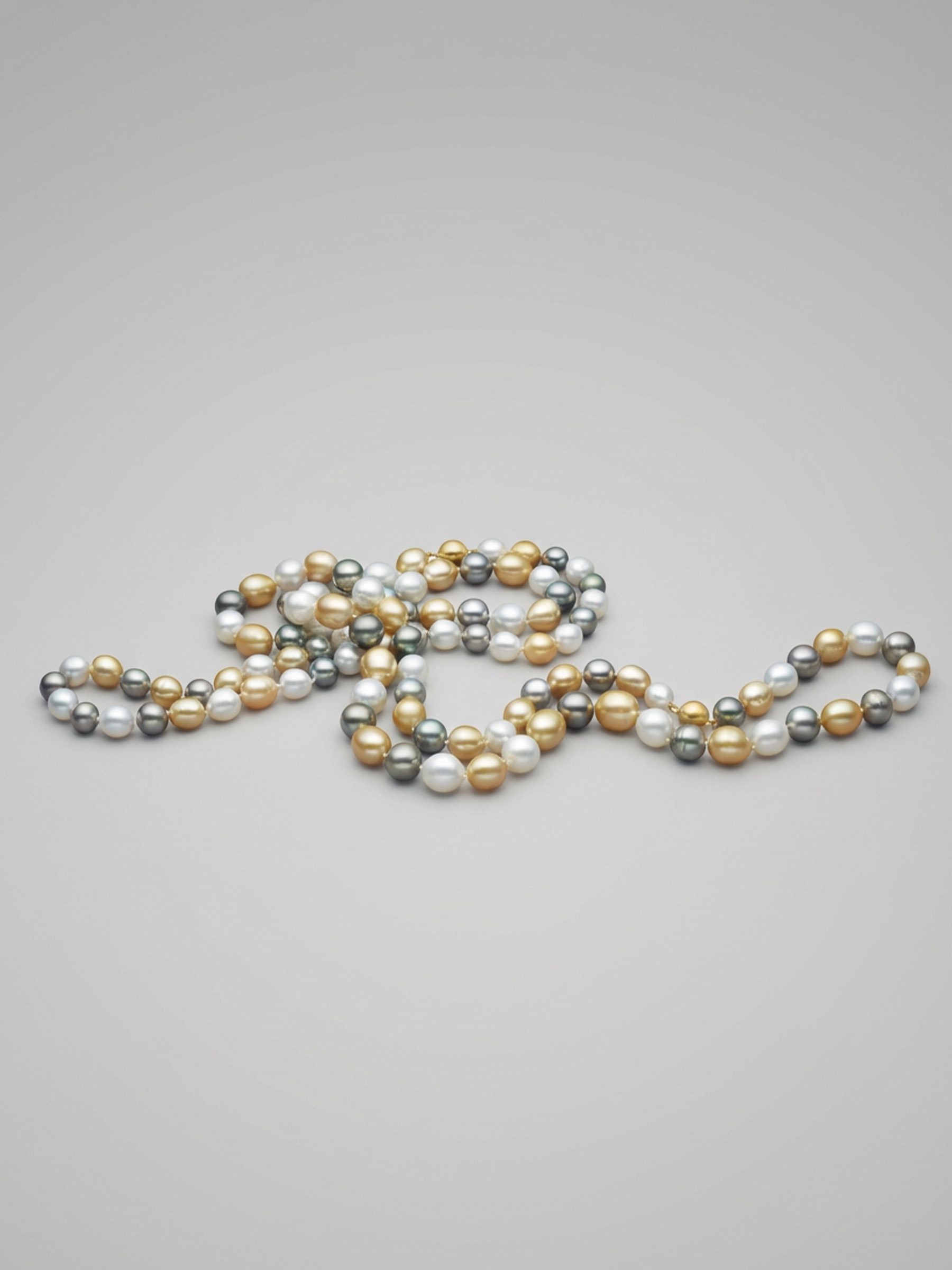 An opera-length pearl strand blending white, golden and Tahitian pearls in a timeless and expressive design.