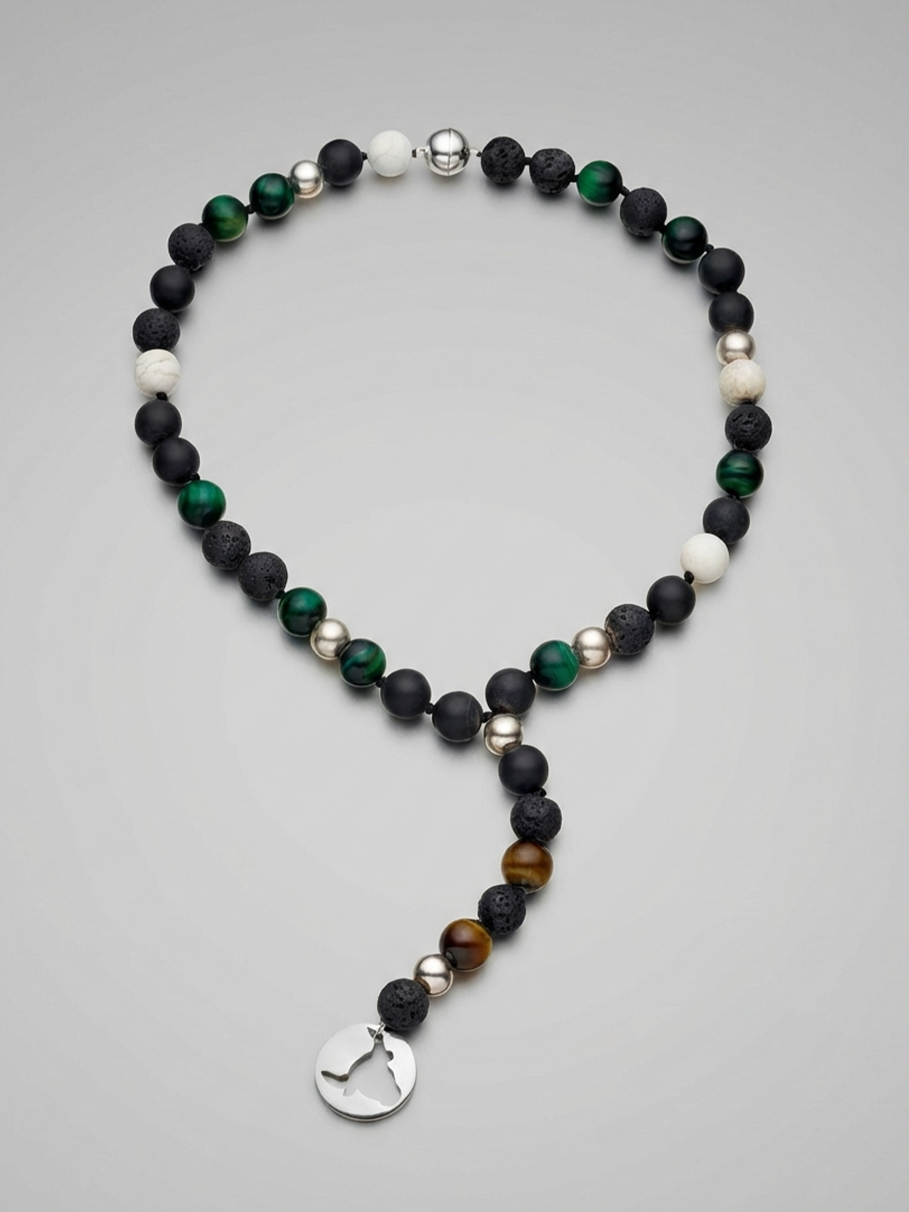 A bold lariat necklace from the Carabez Hombre collection, combining natural stones with a signature sterling silver motif.