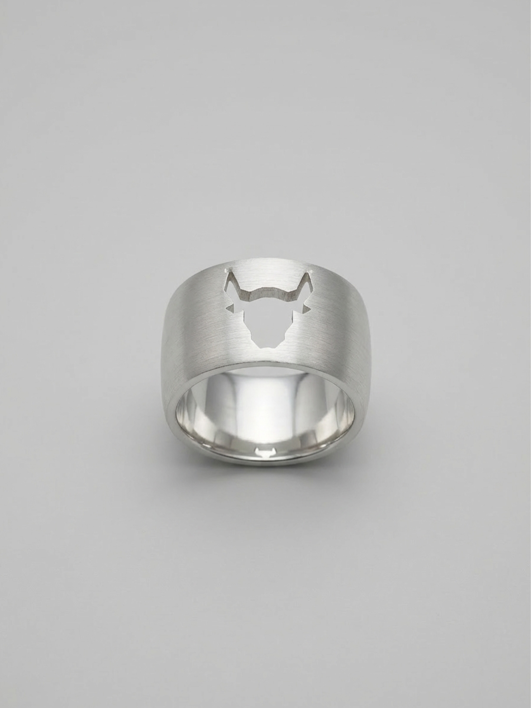 A bold sterling silver ring featuring the signature Carabez Bull motif and a refined brushed finish.