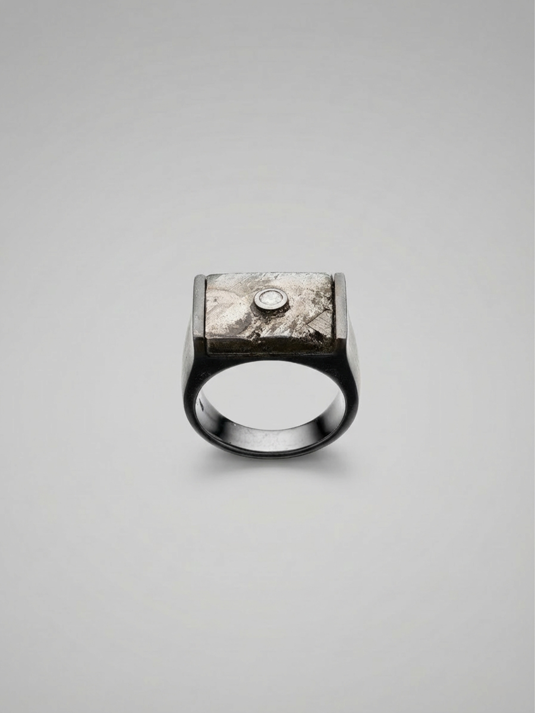 A bold platinum ring combining natural meteorite texture with a refined diamond accent.
