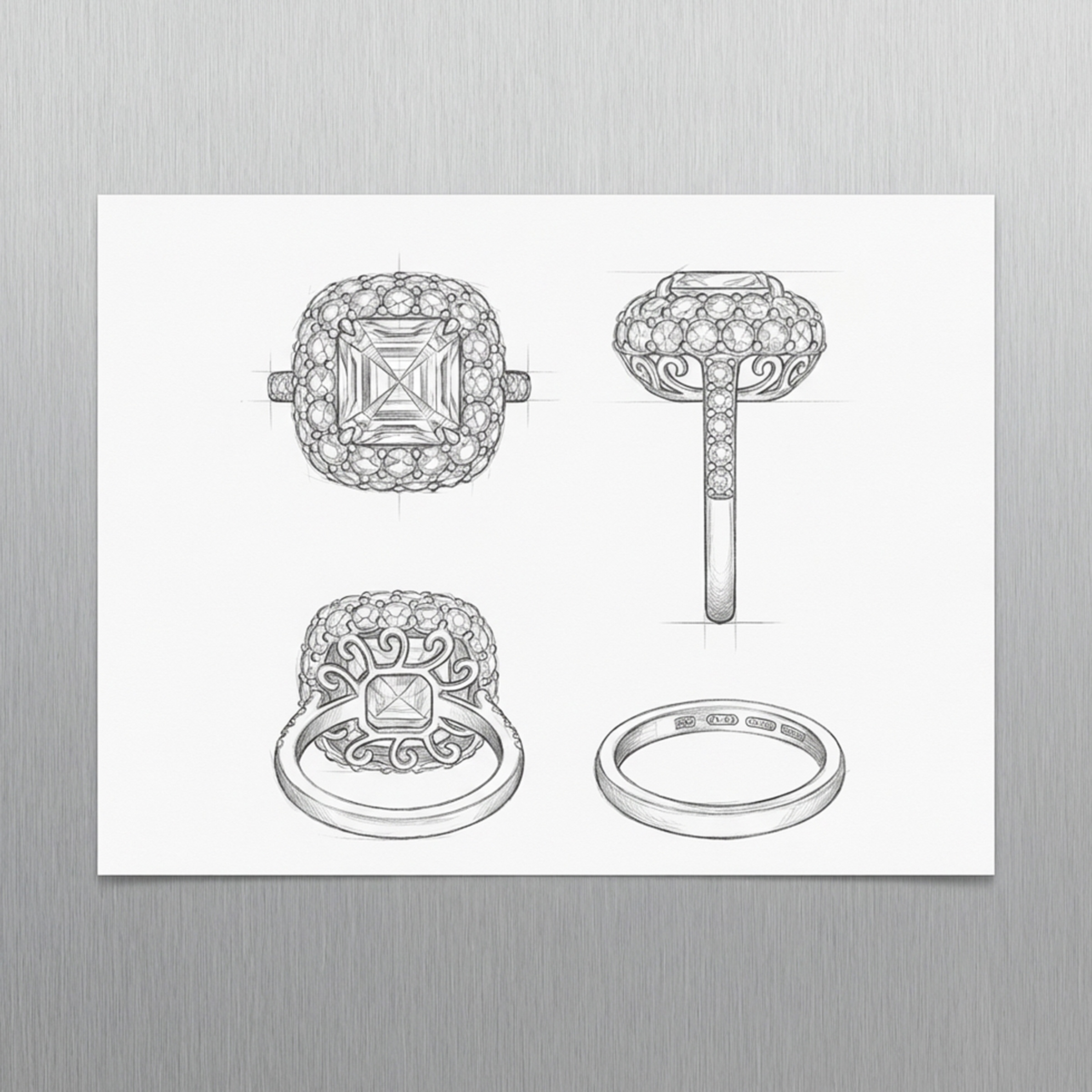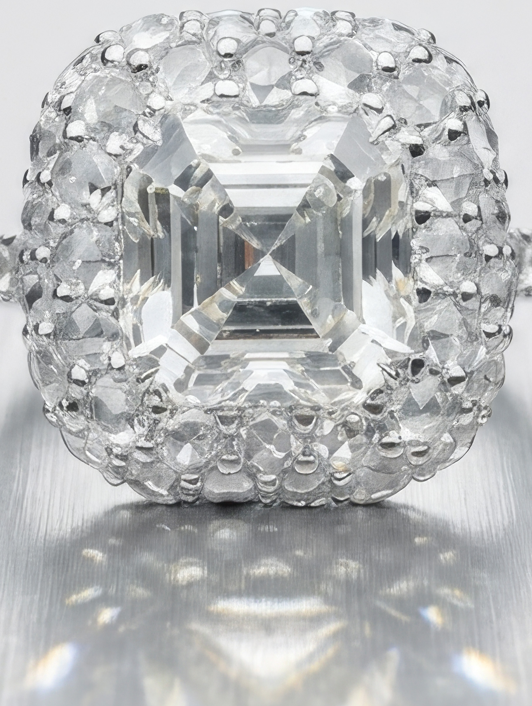 At its centre sits a commanding 5.00ct carré-cut diamond, prized for its crisp geometry, mirror-like facets, and bold presence. Encircling the centre stone is a cushion-inspired halo of 4.50ct of modern rose-cut diamonds, meticulously selected for their soft glow and understated brilliance.