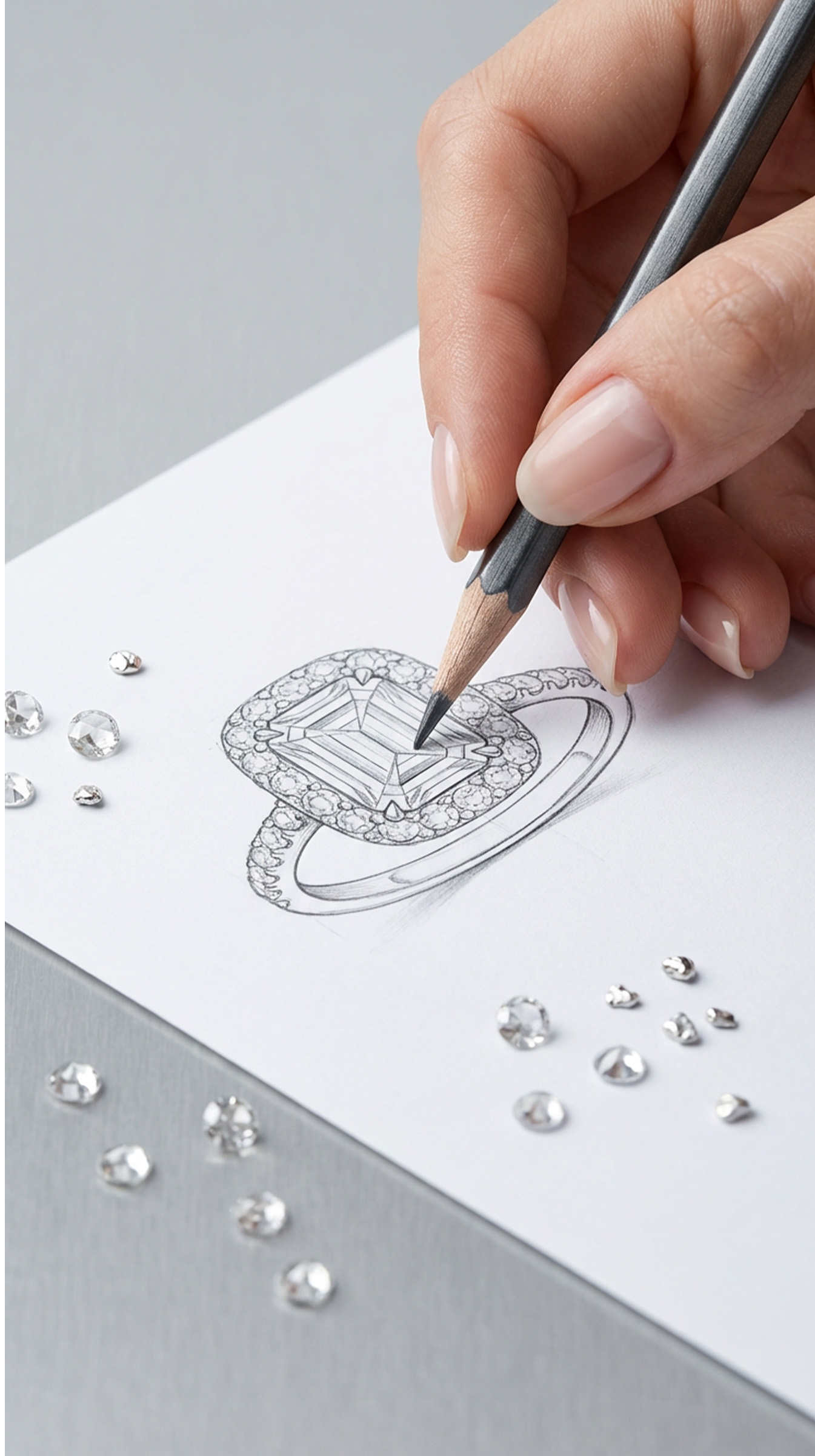 The contrast between the sharp precision of the carré cut and the romantic translucence of the rose cuts creates a captivating interplay of light, depth, and texture.