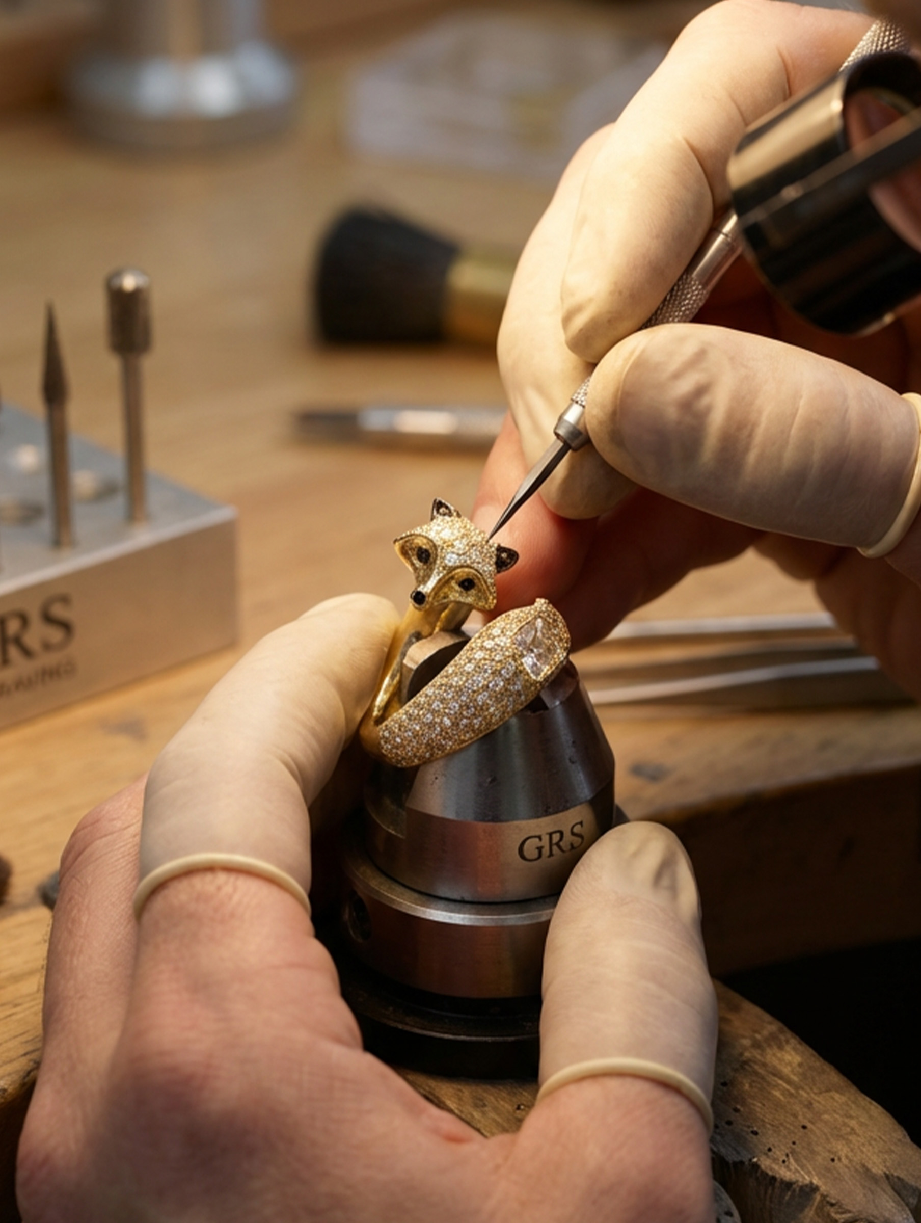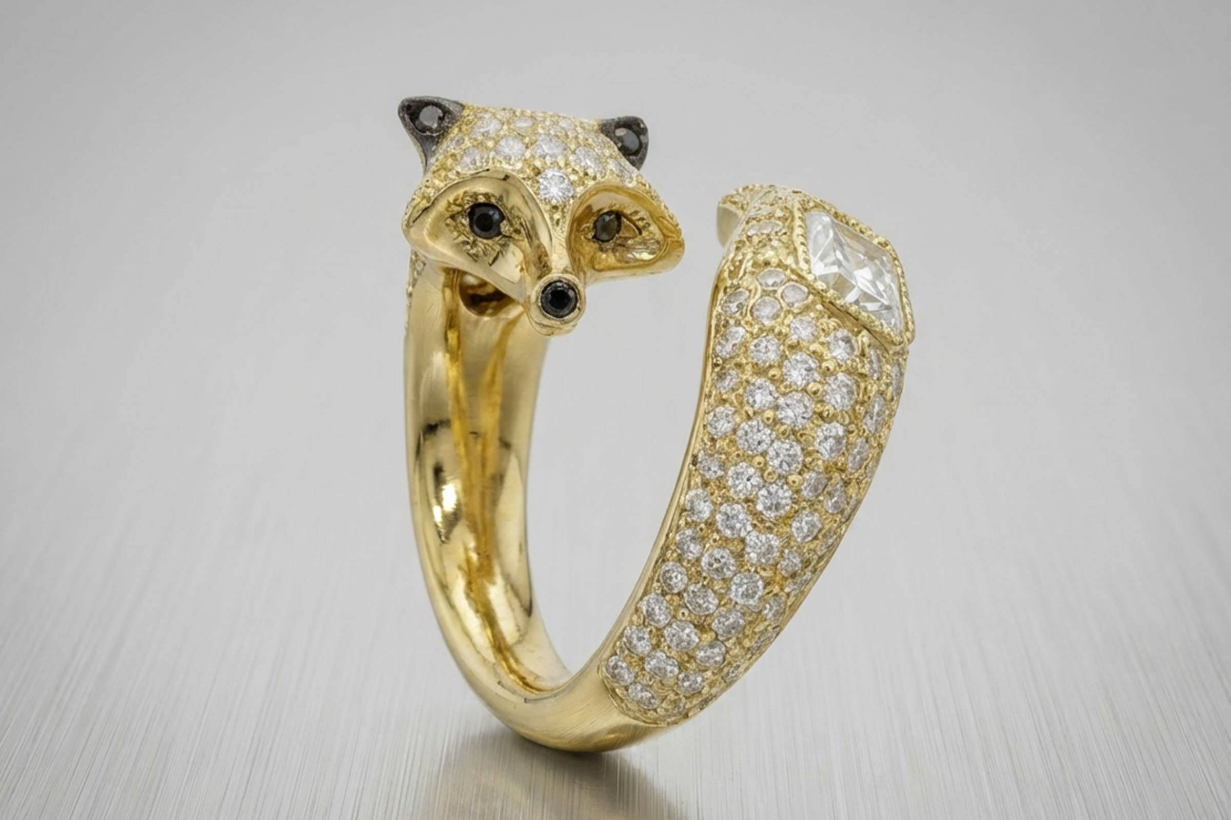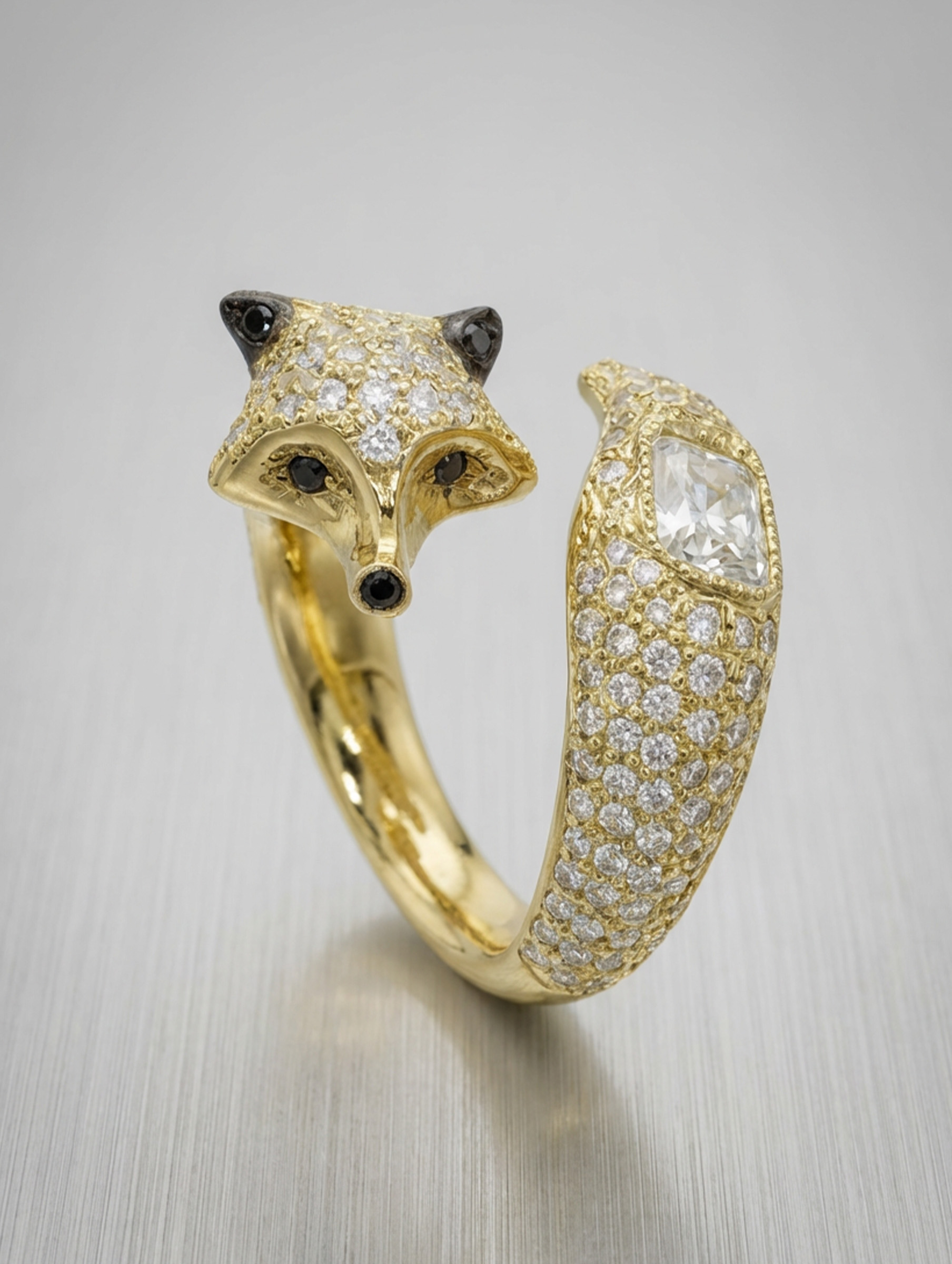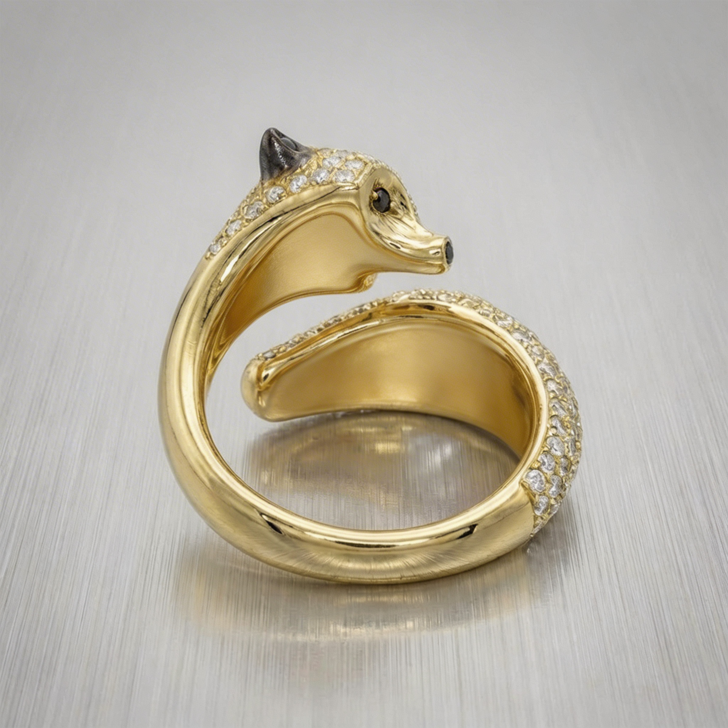 Adding contrast and personality, black diamonds are carefully set to define the fox’s eyes, nose and ears, bringing the design to life with subtle drama and expressive detail. The sculptural form and intricate surface work reflect exceptional hand craftsmanship from every angle.