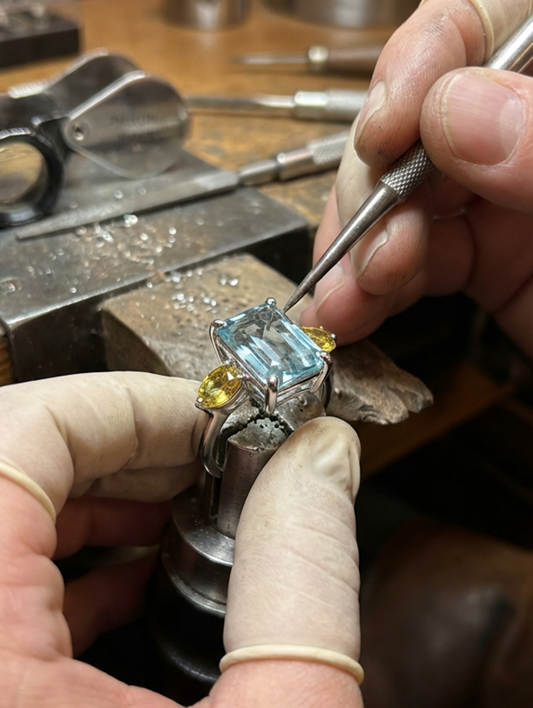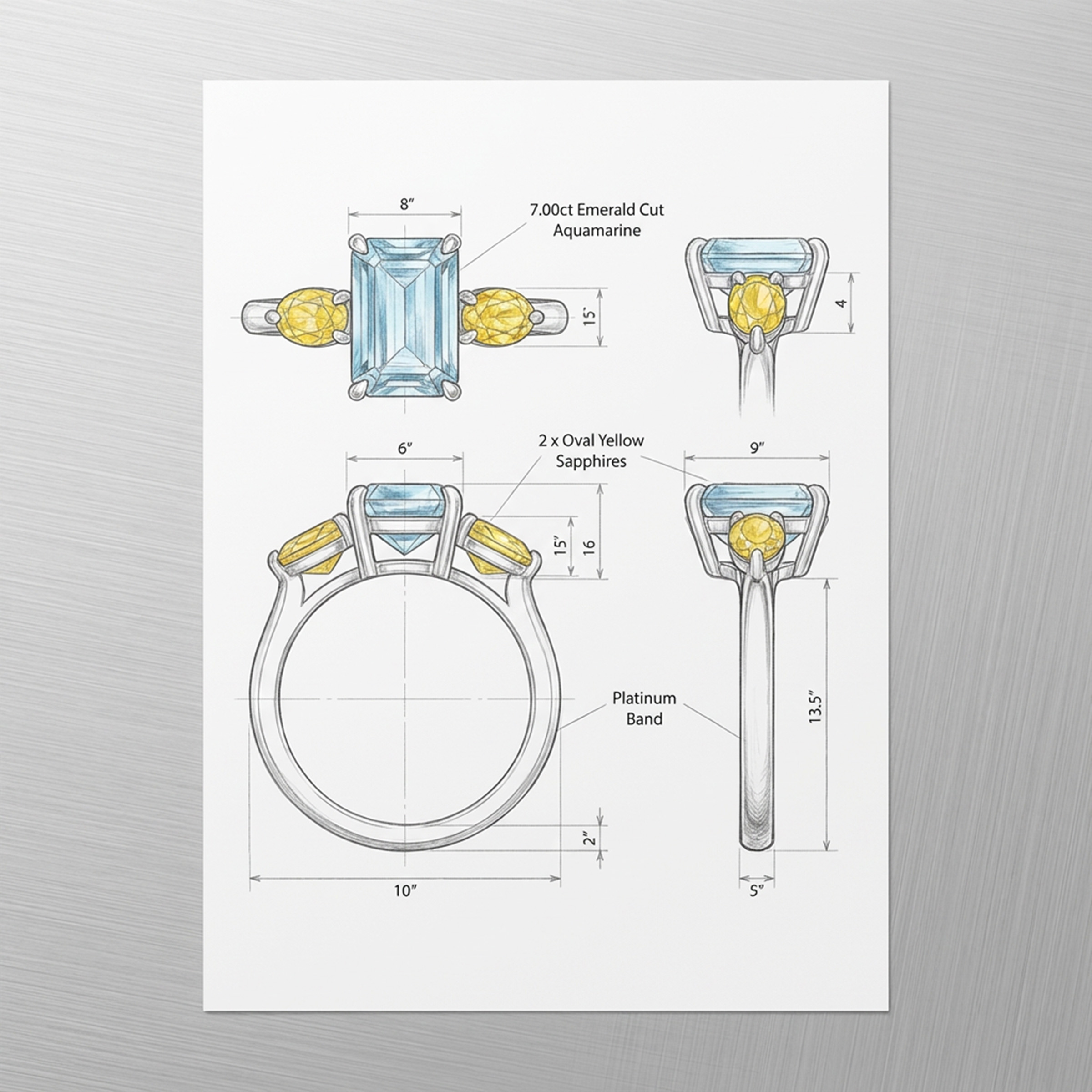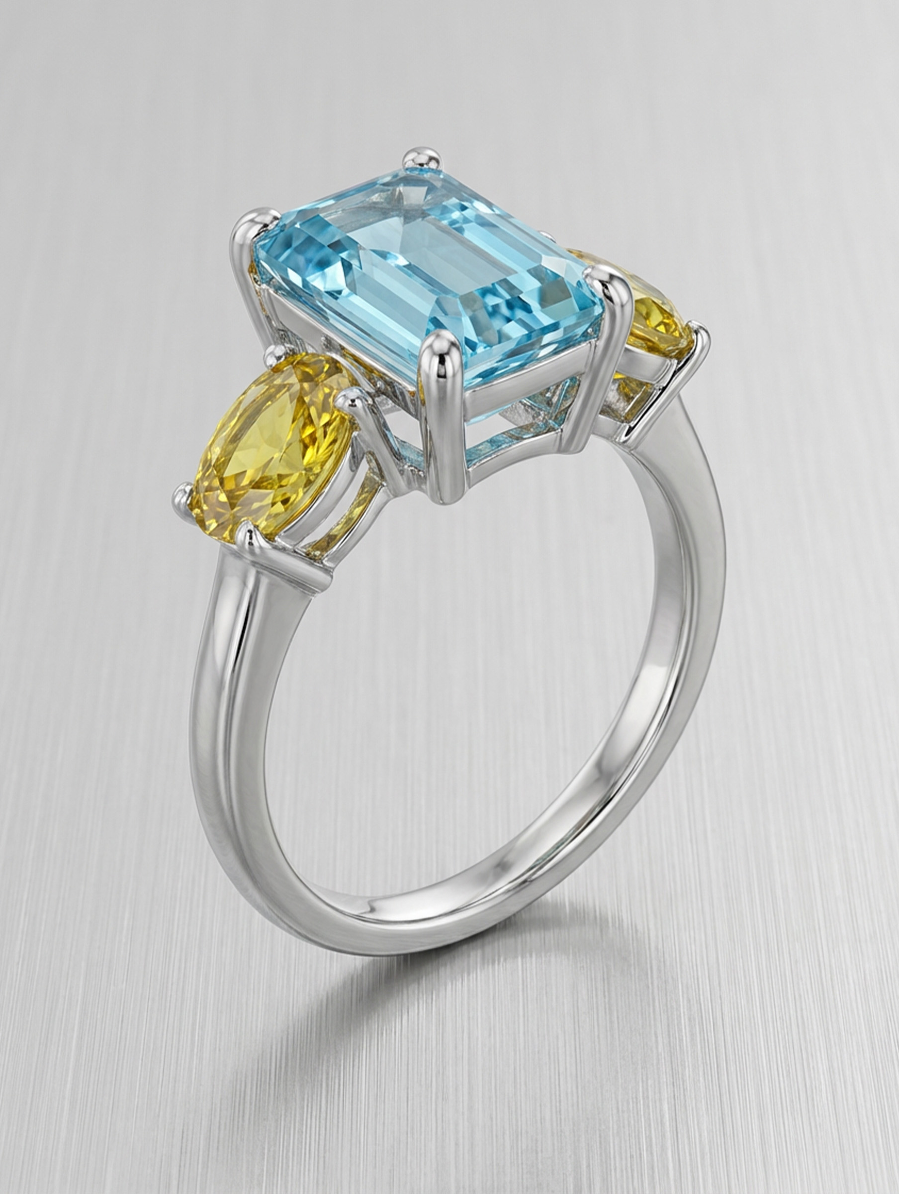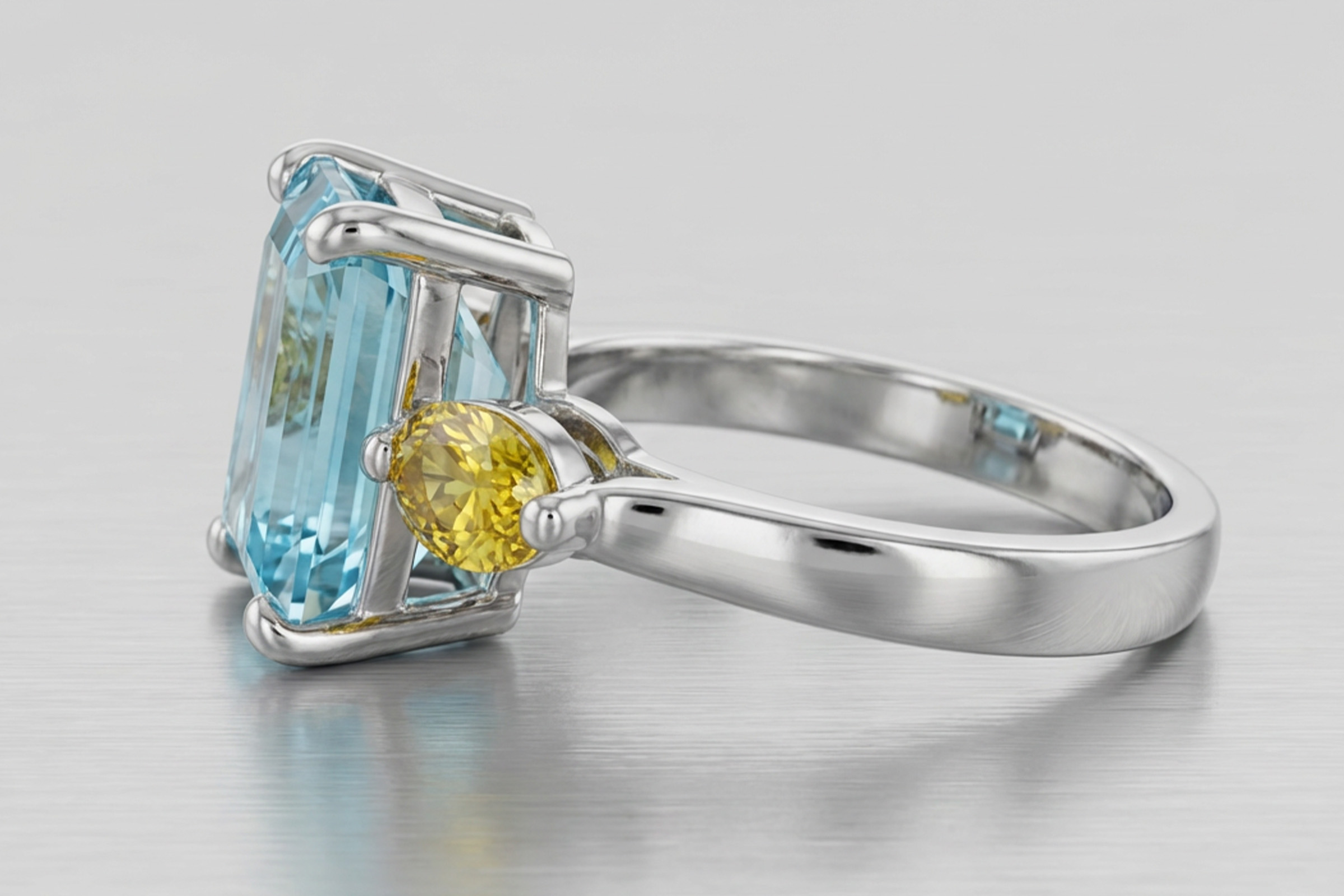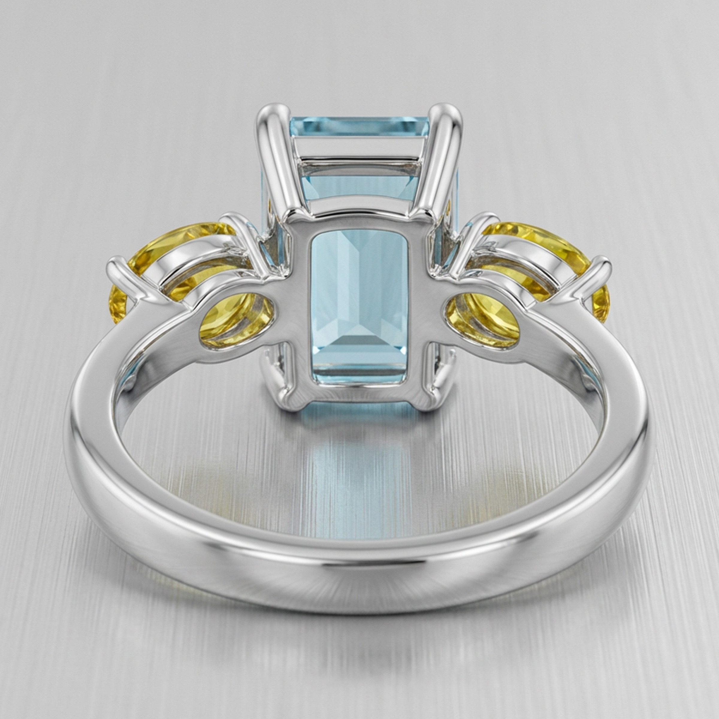 The aquamarine is secured in a classic four-claw setting and set in a vertical orientation, emphasising its elegant step-cut geometry and elongated form. Flanking the centre stone are two vibrant oval yellow sapphires, set in a horizontal orientation within refined two-claw settings, creating a deliberate contrast in direction and movement.
