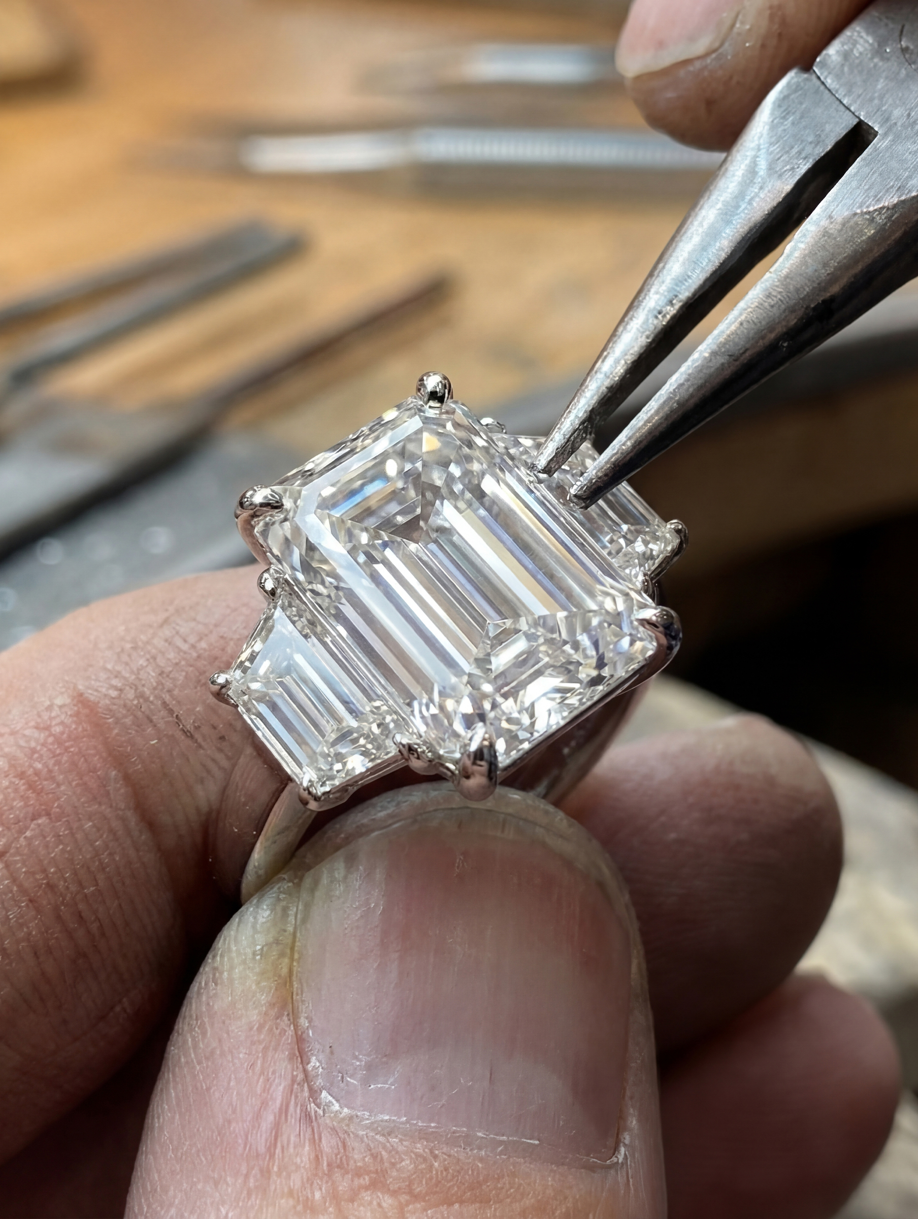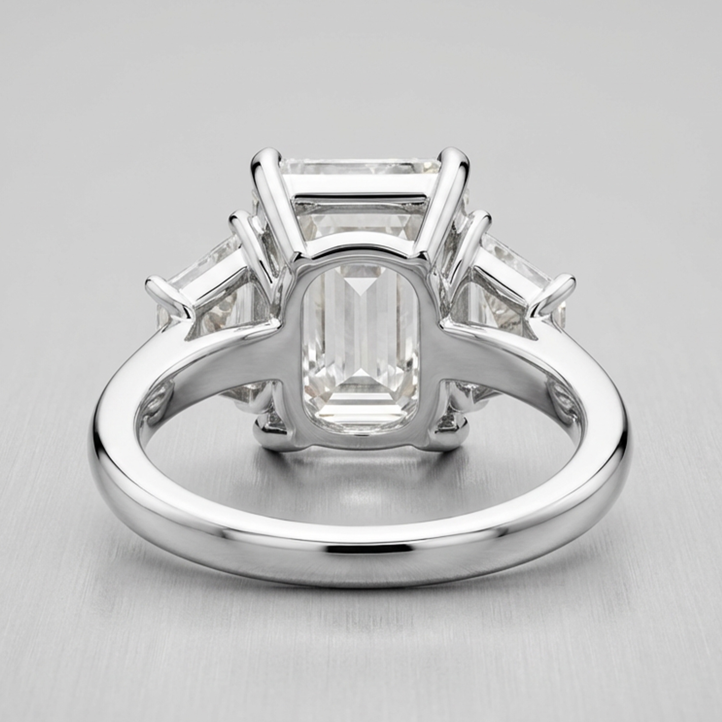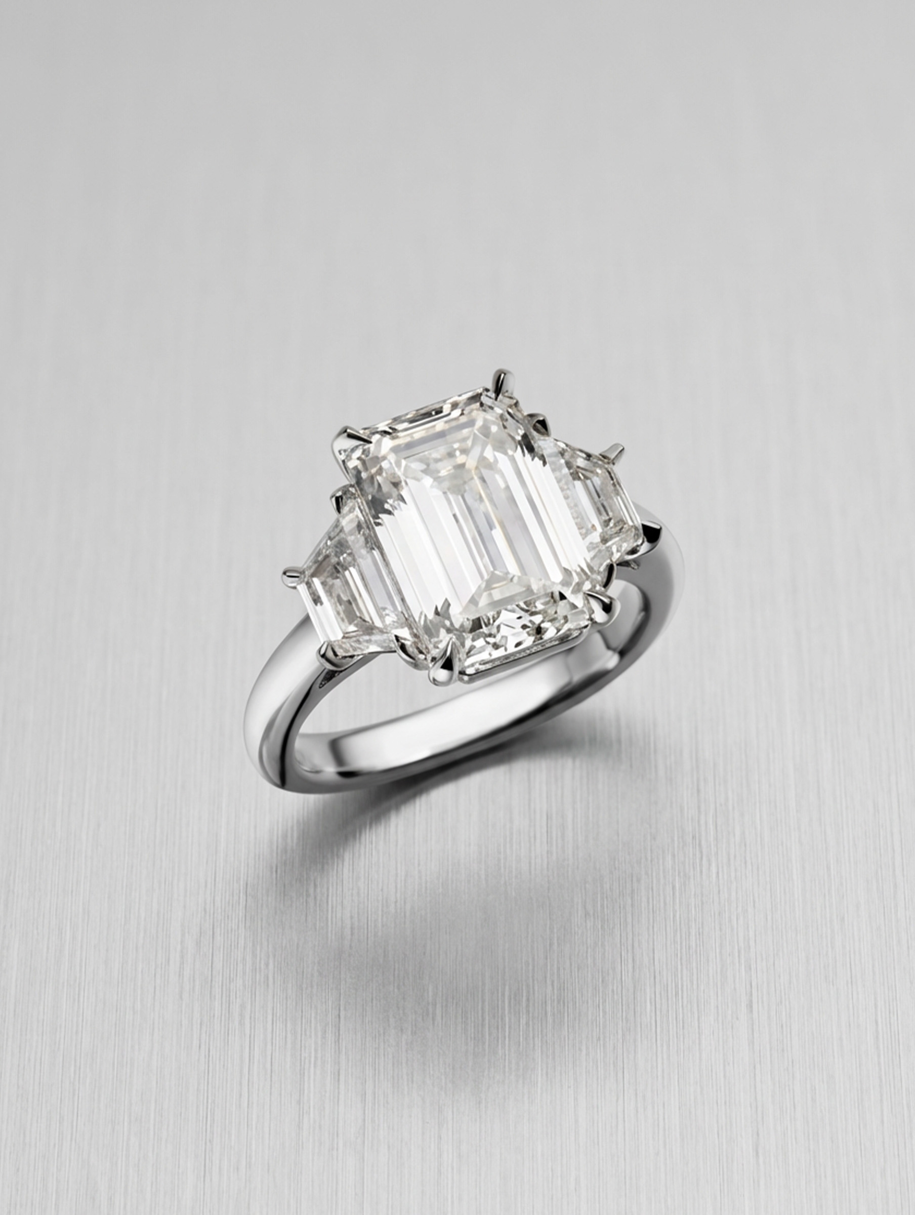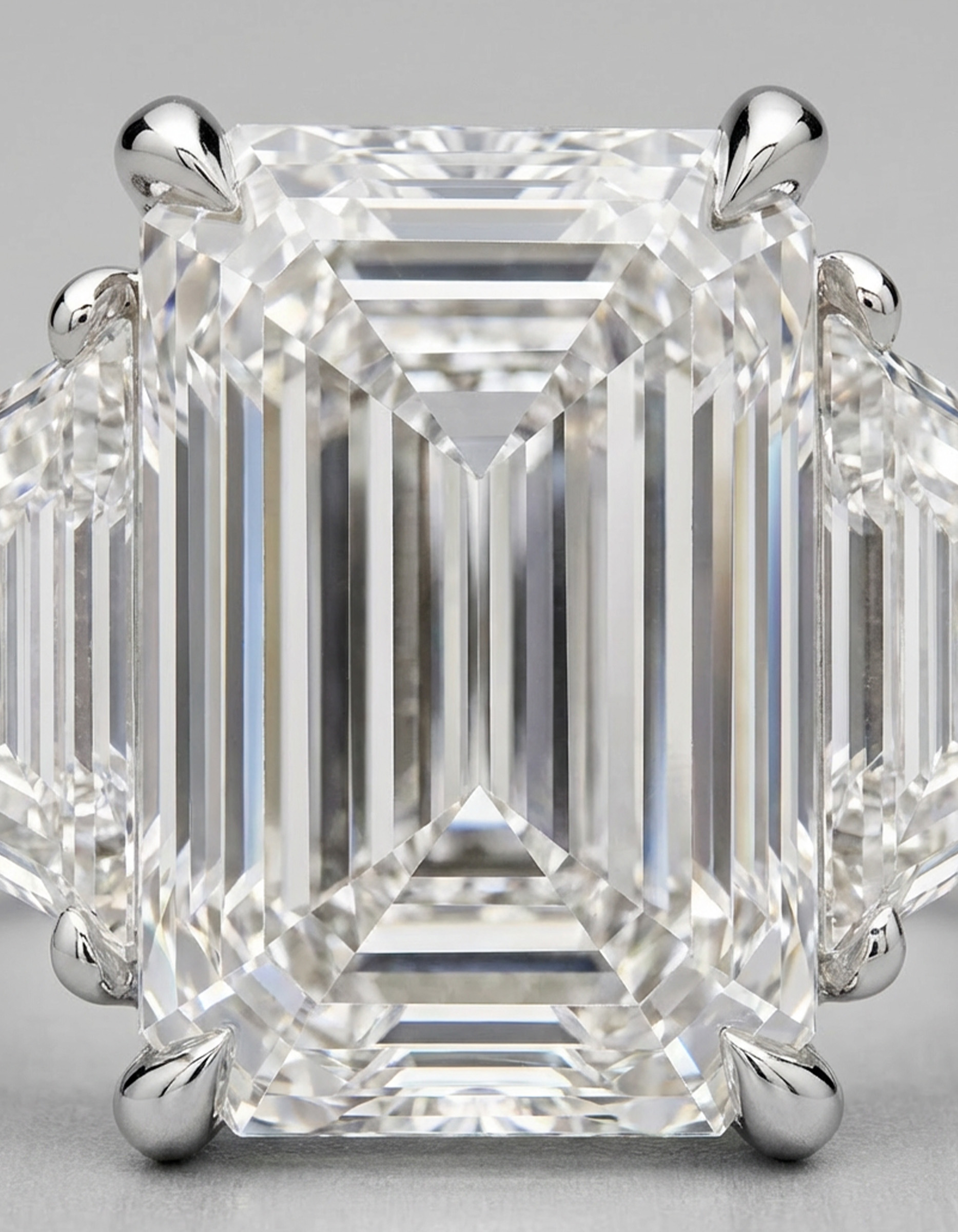 The centre stone is secured in a distinctive eagle claw setting, designed to showcase the diamond’s crisp geometry while providing both strength and elegance. Flanking the centre are two perfectly matched trapezoid-cut diamond shoulder stones, their tapered silhouettes enhancing the emerald cut’s proportions and creating a seamless flow across the hand.